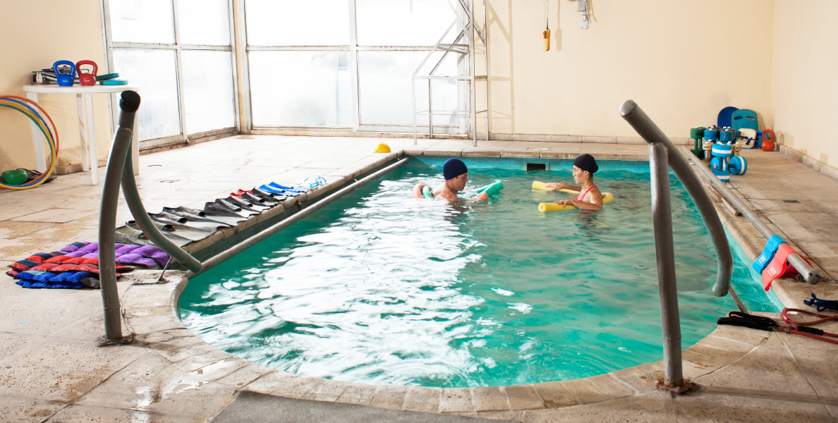 Posee desniveles, accesorios para la terapia acuática (manoplas, flotadores, mancuernas, etc) Aparejo electrónico (para introducir pacientes en la pileta).